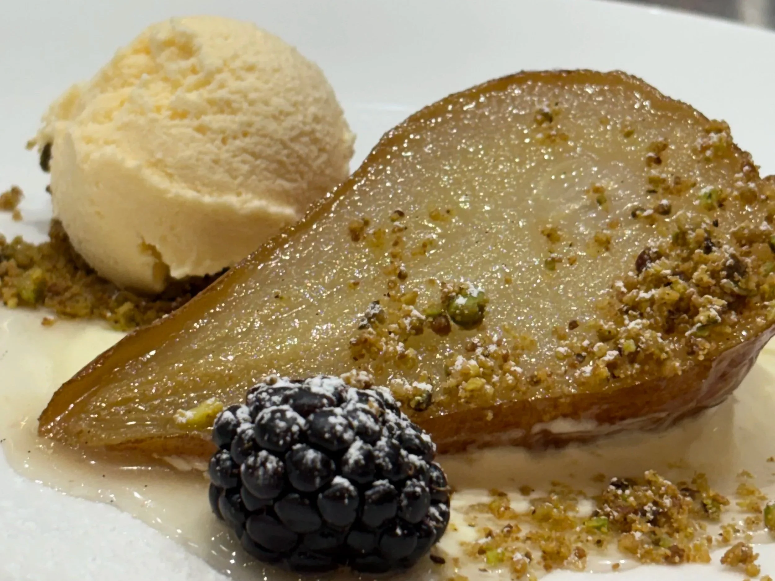 Dessert – Roasted beurre bosc pear with orange blossom honey, pistachio crumble, and vanilla bean ice cream.