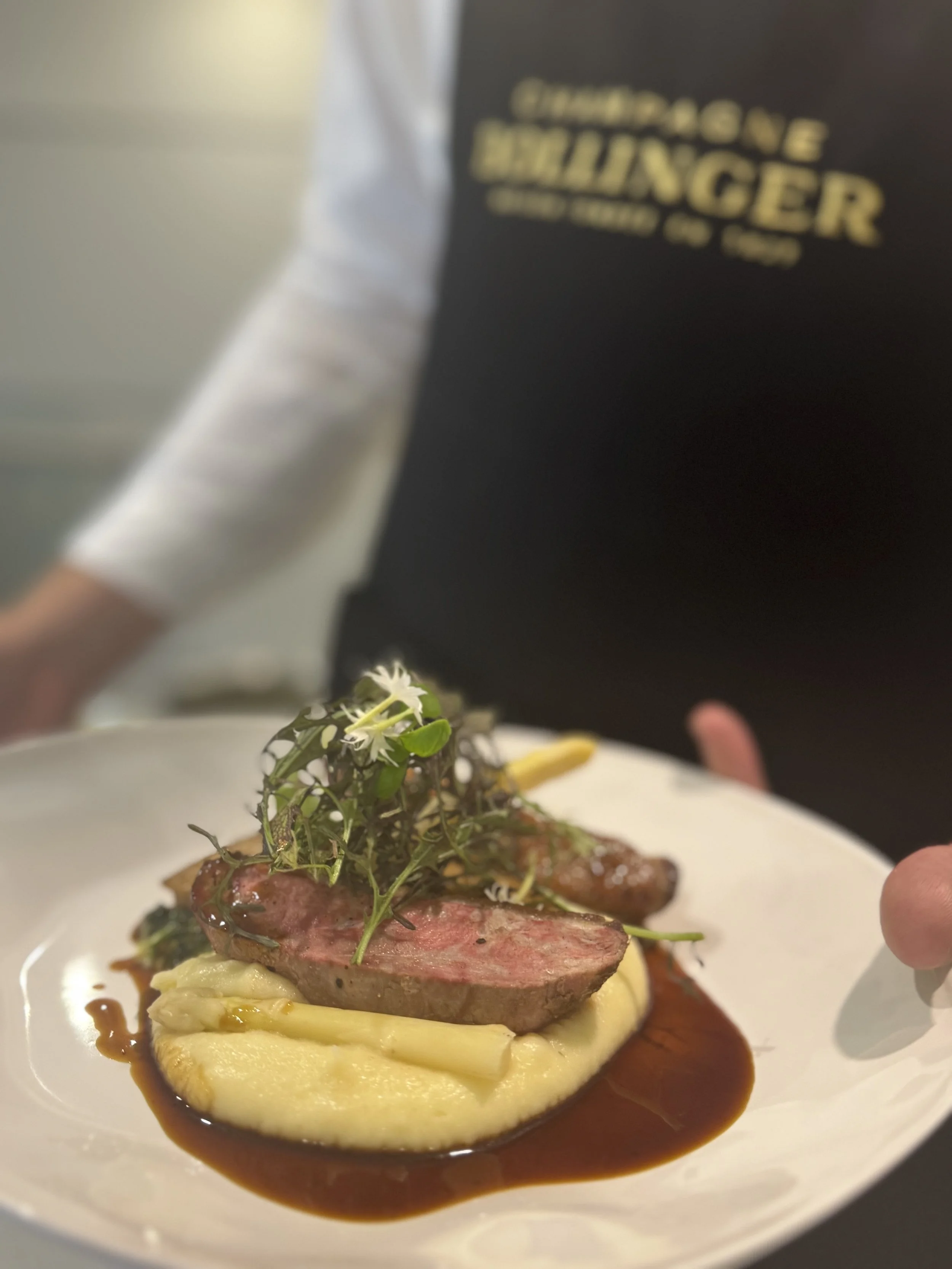 The pairing with Bollinger PN TX20 was particularly striking. This Pinot Noir–dominant Champagne from Tauxières is known for its mineral precision and savoury depth, qualities that resonate beautifully with the umami notes of duck.